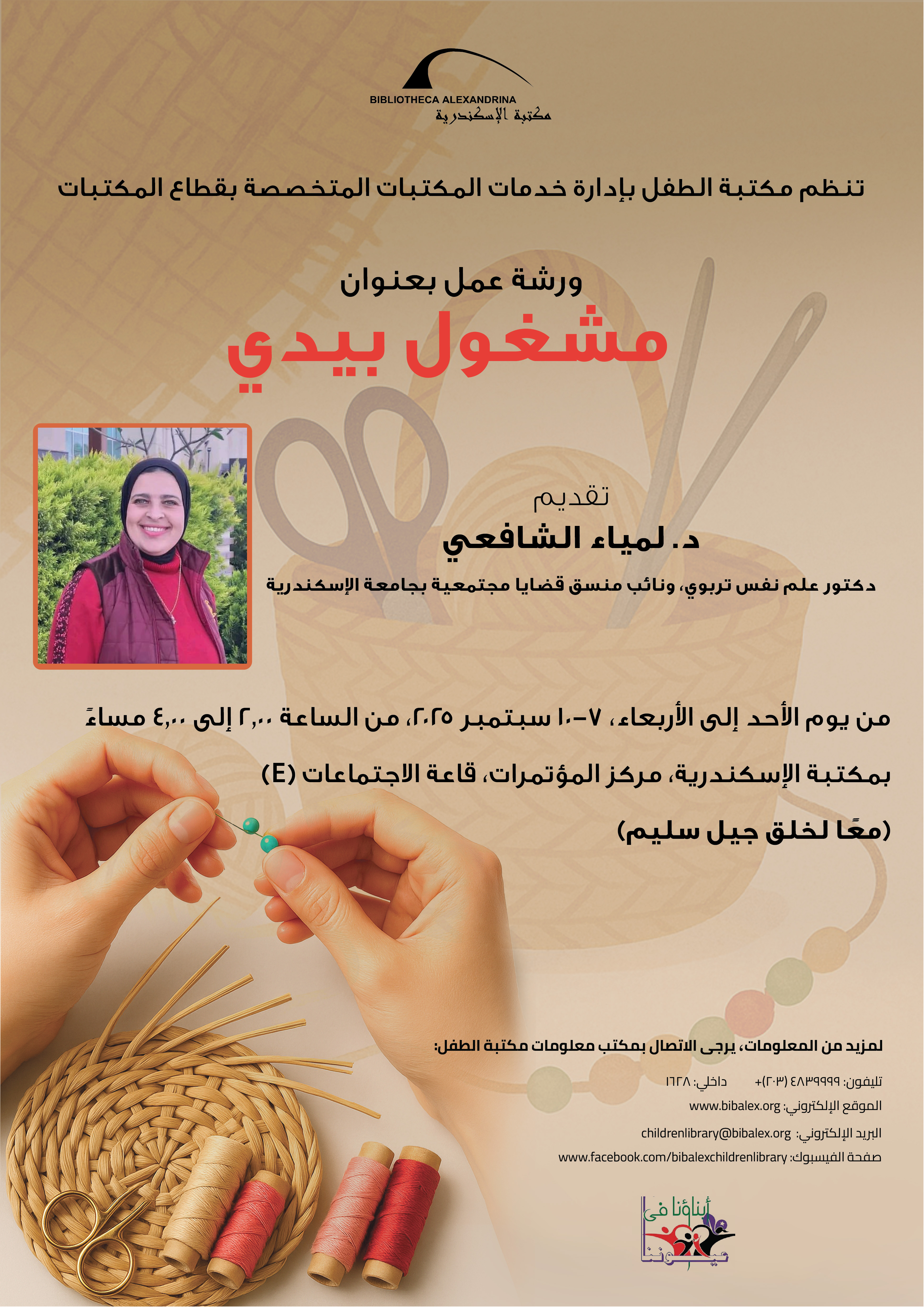 The BA Children's Library is organizing a handicrafts workshop presented by Dr. Lamia Al-Shafei, Prof. of Educational Psychology and Deputy Coordinator of Community Issues at Alexandria University.